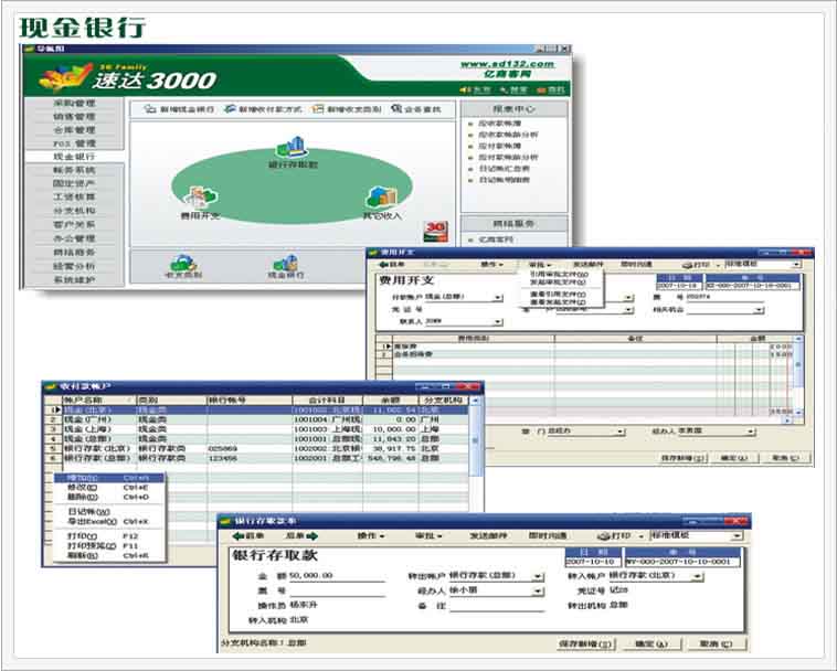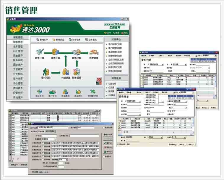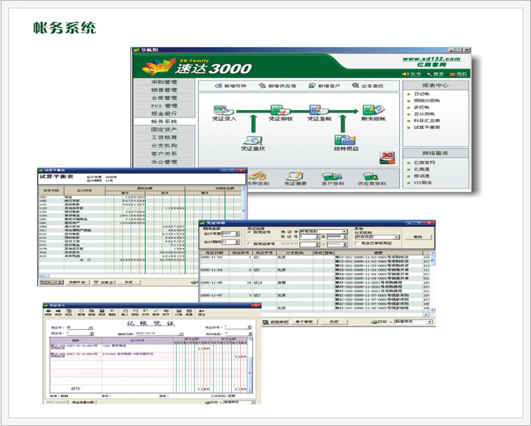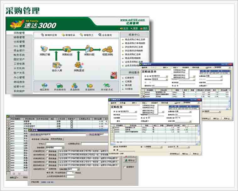 速达3000系统以业务为基础,财务为核心,整个系统一体化设计,功能流畅,操作方便,界面美观友好。包括进货管理、销售管理、仓库管理、帐务系统、工资管理等子系统。