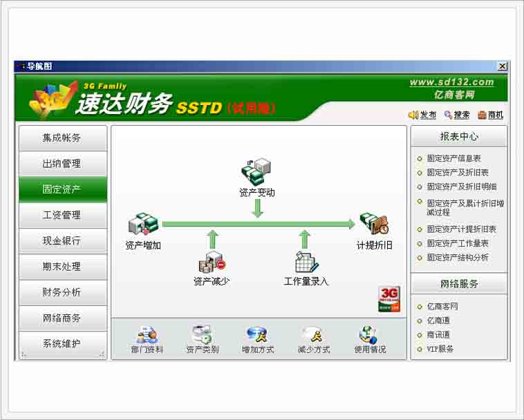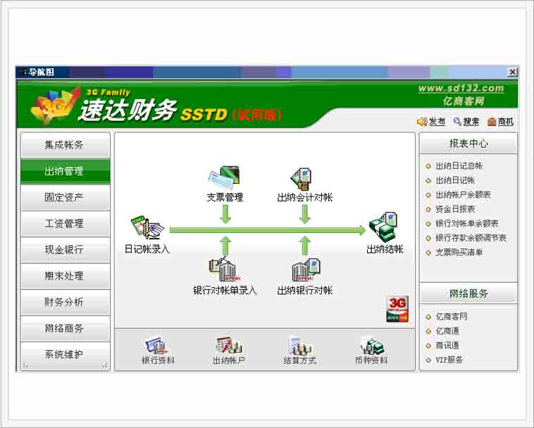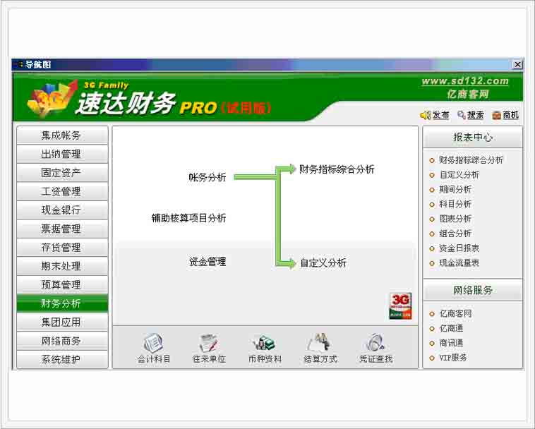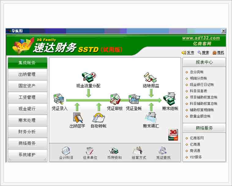 ● 经过国家财政部门评审,可以完全摆脱手工帐 ● 简洁、方便的导航式业务操作,易学、易用 ● 可以多行业、多帐套核算 ● 财务管理高度集成,模块化程度高 ● 出纳管理可单独使用,辅助核算更强大 ● 具备现行会计准则和税制的功能模块设计,功能点更细化、更准确、更贴近用户需要 ● 报表种类更多、更适用,分析范围更广泛 ● 集团应用可以把企业集团的所有分支机构报表迅速汇总到总部,方便管理者在第一时间获取汇总数 据,了解并对比各分支机构经营状况,便于作出及时准确的决策 ● 实现与亿商客网信息互动,与68万速达用户共享即时信息