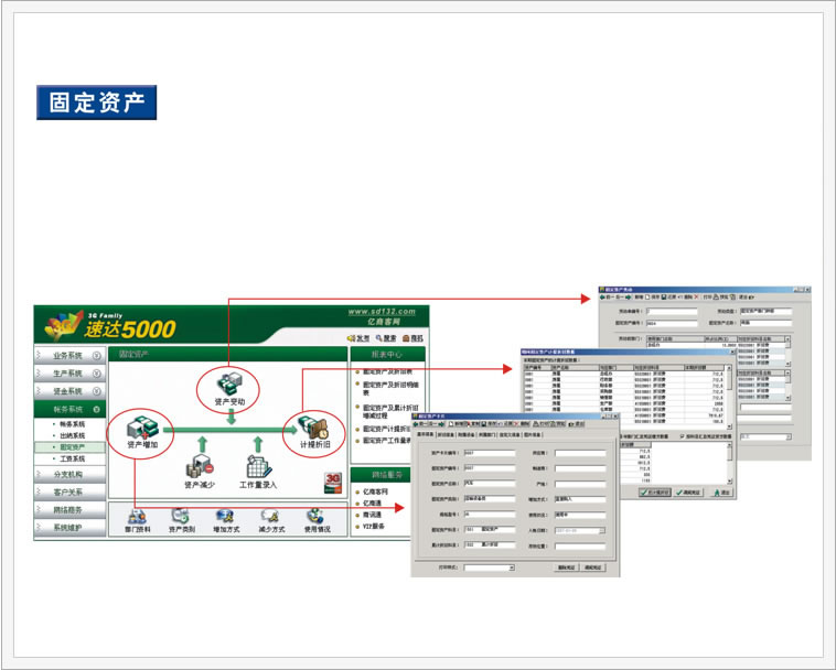 包括资产增加、资产减少、资产变动、工作量录入计提折旧等功能模块。